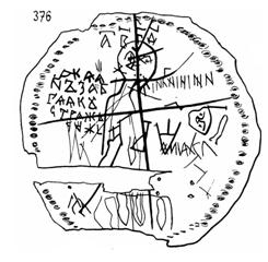 Наибольший интерес из предполагаемых памятников этого письма представляет «алекановская» надпись. Надпись эта, нанесенная на глиняный сосуд X—XI вв., открыта в 1897 г. В. А. Городцовым при раскопах у села Алеканово под Рязанью; надпись содержит 14 знаков, расположенных в строковой планировке. В 898 г. там же на обломках посуды обнаружено еще пять аналогичных знаков. Как указывает В. А. Городцов, «сосуд плохо обожжен, изготовлен, очевидно, наспех. следовательно, изготовление местное, домашнее, а, следовательно, надпись сделана местным или домашним писцом, т. е. славянином». Знаков слишком много, чтобы их можно было принять за клеймо мастера. «Остается предположить,- делает вывод В. А. Городцов, — что знаки представляют собой литеры неизвестного письма».