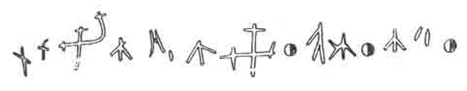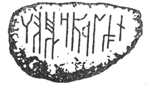 Представляет также интерес «надпись» (если только считать ее надписью, а не комбинацией трещин от огня) на ребре барана, открытая около 1916 г. Д. Я. Самоквасовым при раскопках курганов у Чернигова. «Надпись» содержит 15 — 18 знаков, расположенных внутри полуовала. «Знаки, — пишет Д. Я — Самоквасов, — состоят из прямых резов и, по всей вероятности, представляют собой русское письмо X в., на которое имеются указания в некоторых источниках».