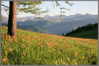 Пылающий ковер огоньков прекрасно гармонирует со свежей весенней зеленью. На фоне вершины Теректинского хребта. Крайняя справа – священная гора Уч-Энмек.