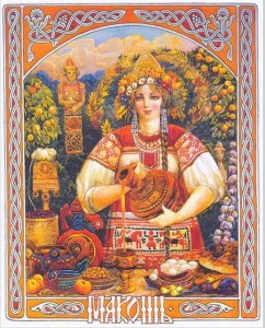 Богиня всей Судьбы, старшая из прях, богиня плодородия и связана с урожаем, имеет 12 годовых праздников, иногда изображена с рогами (с косами), упомянутая в русских летописях и многочисленных поучениях против язычества (например «Слово о мздоимании» 16 века, «Слово о покаянии» 16 века). Единственная богиня из пантеона кн. Владимира. Изображена богиня Макошь на русских вышивках между двух лосих — Рожаниц, иногда изображена с рогом изобилия. Как следствие хтоничности — непропорционально большая голова на изображениях. Ее день — Пятница, ее металл — серебро, камень — горный хрусталь и т.н. «лунный камень».