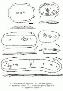 Из числа элементов погребального обряда следует назвать: курганные насыпи, погребальное сооружение в виде человеческого жилища и захоронение праха умершего в обычном горшке для еды.