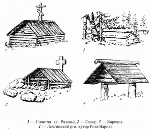 Этот погребальный элемент отмечает и Олеарий в XVII в.: «Над могилами хоть несколько состоятельных покойников русские… ставят небольшие избушки, в которых стоя может поместиться один человек».